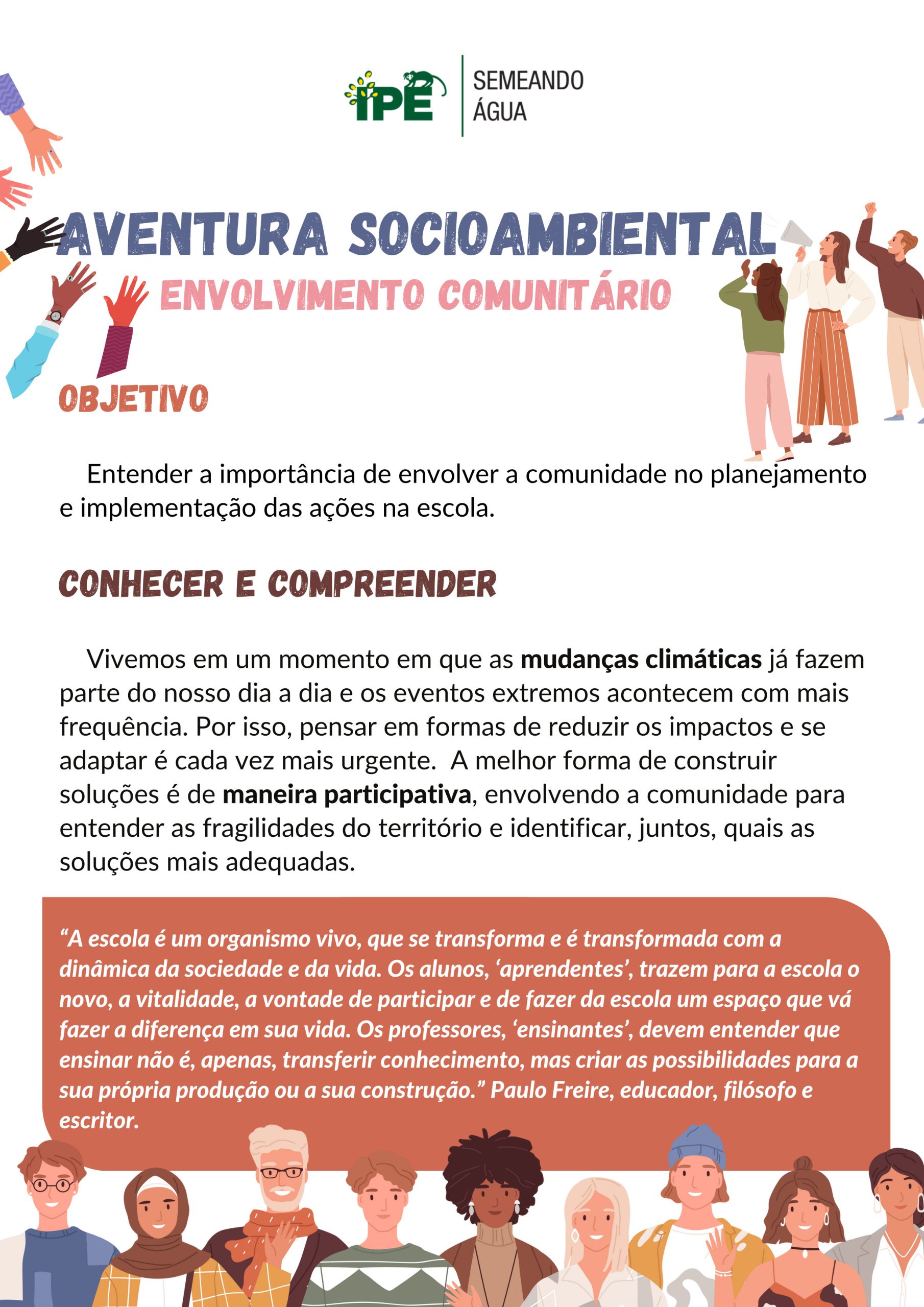 Aventura Socioambiental: Envolvimento Comunitário 17/12/2025 Aventura Socioambiental: Envolvimento Comunitário Entender a importância de envolver a comunidade no planejamento e implementação das ações na escola. Download Série Aventura Socioambiental