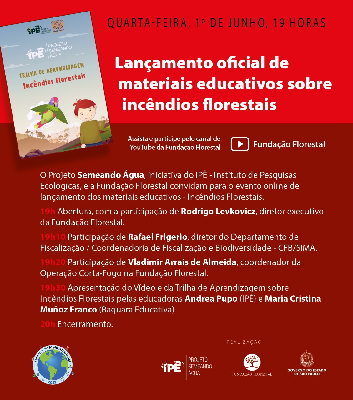 Na semana do Meio Ambiente, confira a Live de lançamento do vídeo e da trilha de aprendizagem sobre Incêndios Florestais, 01/06 às 19hrs, no canal da Fundação Florestal no YouTube. Os materiais educativos são uma parceria entre o projeto Semeando Água/IPÊ, a Fundação Florestal e a Baquara Educativa.