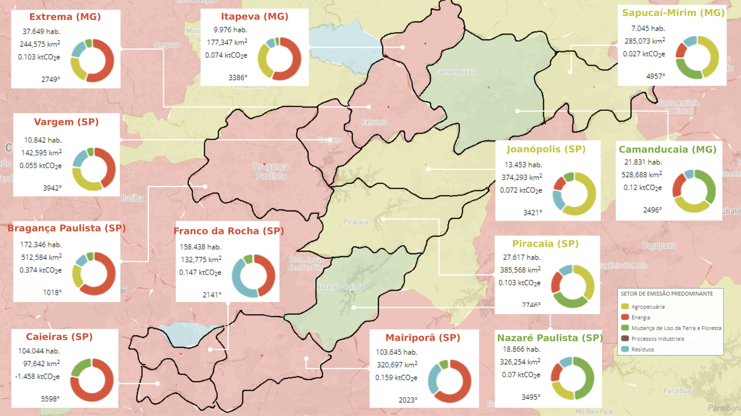 No mapa abaixo é possível visualizar as principais fontes de emissão das cidades que compõem o Sistema Cantareira. Os municípios estratégicos para o abastecimento do Sistema, aqueles que possuem maiores áreas dentro das bacias hidrográficas em questão, têm como maior fonte de emissão a categoria “mudança de uso da terra”.