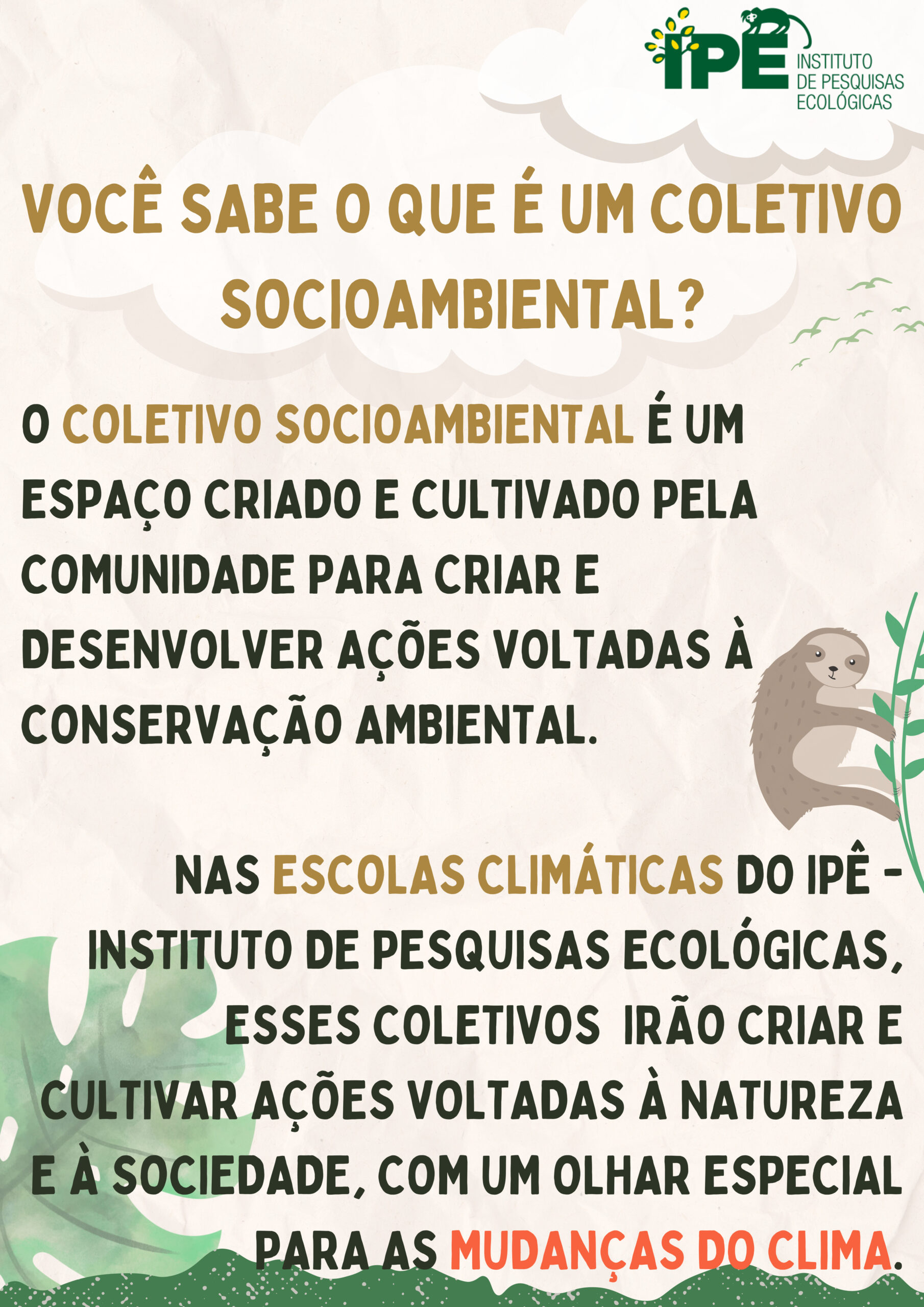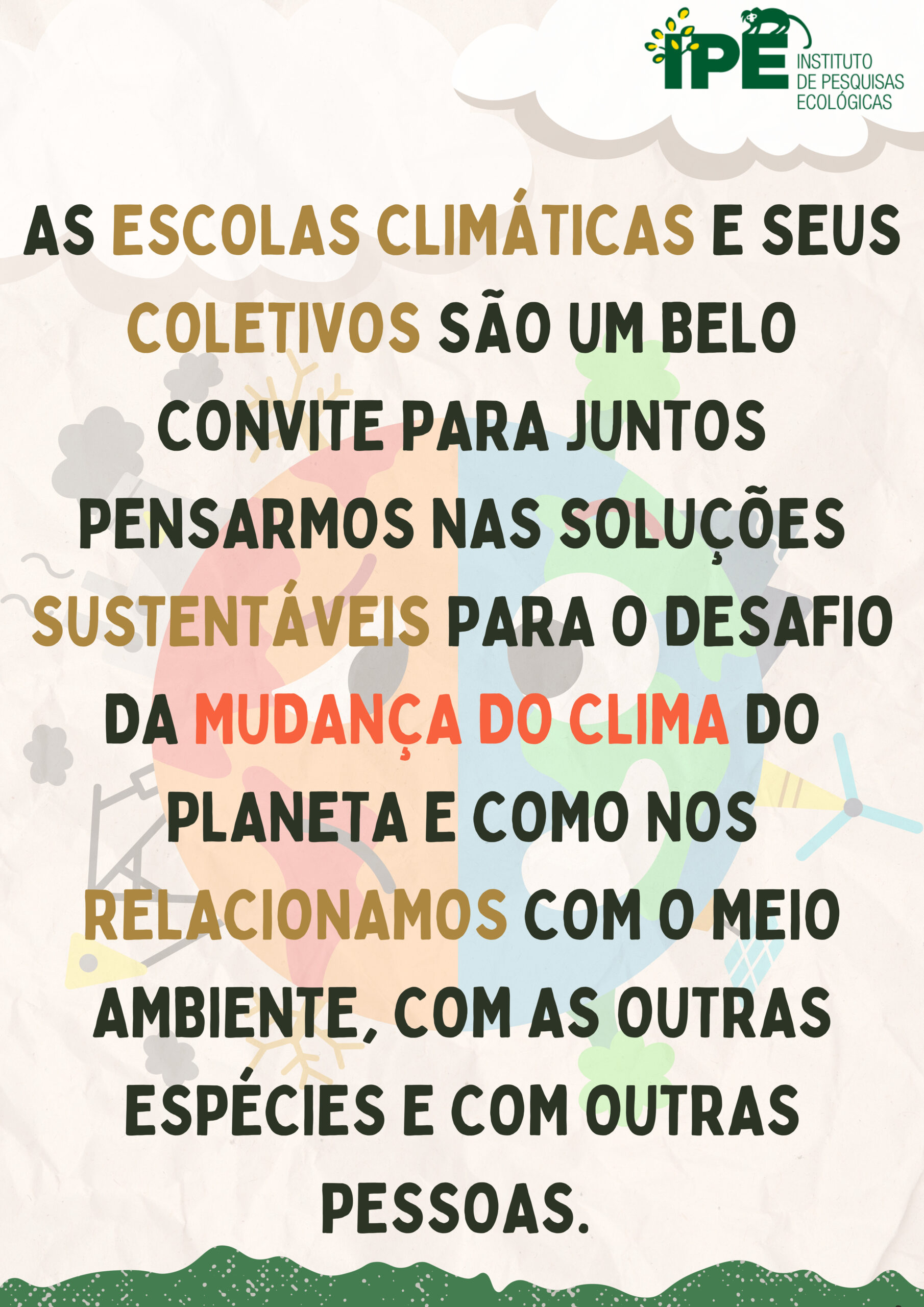 Para realizar e cuidar das ações de sustentabilidade, as Escolas Climáticas estão dando início à formação de seus coletivos socioambientais. As escolas estão localizadas na região do Sistema Cantareira, onde são realizadas atividades de educação ambiental do Projeto Semeando Água, uma iniciativa do IPÊ – Instituto de Pesquisas Ecológicas, com patrocínio da Petrobras, por meio do programa Petrobras Socioambiental. As Escolas Climáticas do Cantareira contam também com o patrocínio do Instituto Alair Martins (IAMAR).