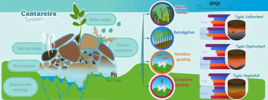 As funções do solo e o Índice de Qualidade Física do Solo (SPQI) foram calculados com variação de 0 a 1, em que ótimos cenários receberam valor 1 e piores cenários valor 0. O estudo confirma que as florestas nativas apresentaram a pontuação mais alta no índice de qualidade de potencial de recarga de água subterrânea na camada superficial do solo, de 0,72 em Cambissolos  – solos jovens e pouco profundos – contrastando com 0,16 para pastagem extensiva com sinais de degradação, o que na prática mostra 350% de diferença.