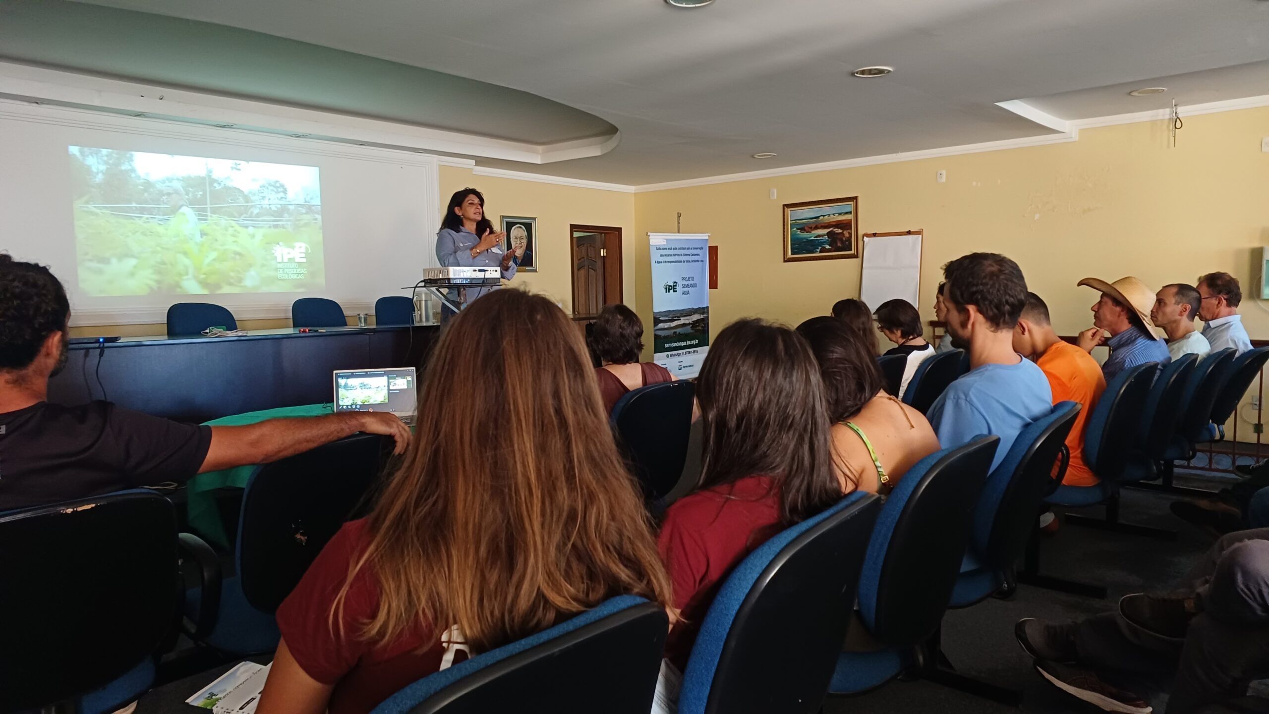 Simone Tenório, coordenadora da frente de Políticas Públicas e Desenvolvimento Econômico Territorial do Projeto Semeando Água apresentou as estratégias integradas do projeto que promovem a mudança de uso de solo em propriedades rurais, por meio da implantação de Sistemas Produtivos Sustentáveis – como Sistemas Agroflorestais, Silvicultura de espécies nativas da Mata Atlântica e Manejo da Pastagem Ecológica, foco deste evento. Na agropecuária, a técnica melhorar a permeabilidade e fertilidade do solo, possibilitando a aumentar a quantidade de animais por hectare ou reduzir seu tempo de ocupação na propriedade.