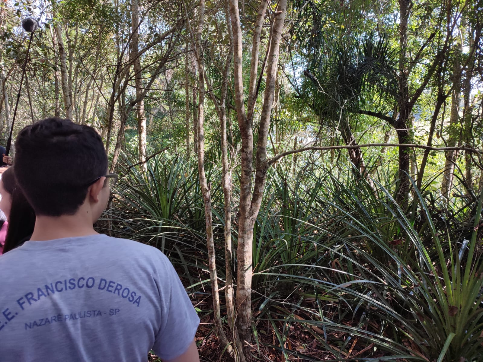 Nesta mesma data os estudantes de geografia do segundo ano do ensino médio da Escola Estadual Francisco Derosa, localizada no centro de Nazaré Paulista, visitaram a área de Restauração Ecológica do IPÊ, a fim de aprofundar o que vinham estudando em sala de aula sobre Unidades de Conservação. Durante a trilha fizeram um “banho de floresta”, ficando em silêncio dentro da mata para aprimorar outros sentidos, ouvindo os sons e percebendo os aromas da mata.