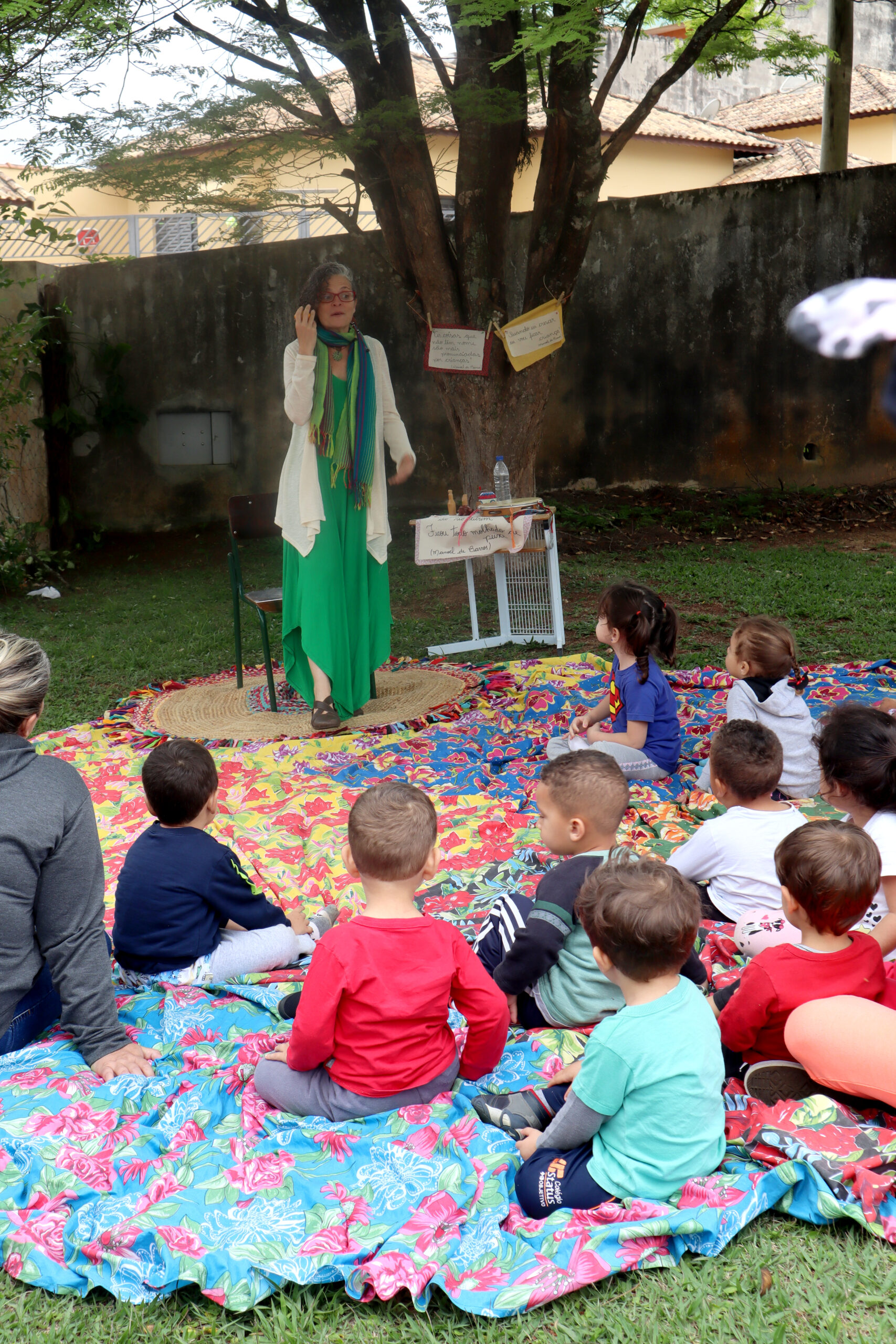 A atividade foi protagonizada por Vivian Catenacci, artista narradora há 24 anos e escutadeira de histórias desde sempre. Vivian planta sementes na terra e no imaginário de toda gente, através do “Núcleo Boca da Mata de Agroecologia e Cultura”, em Piracaia (SP), onde é co-idealizadora e produtora cultural. Catenacci conta que “os enredos favorecem a escuta e apropriação da narrativa, para memorização e reconto no cotidiano dos ouvintes.