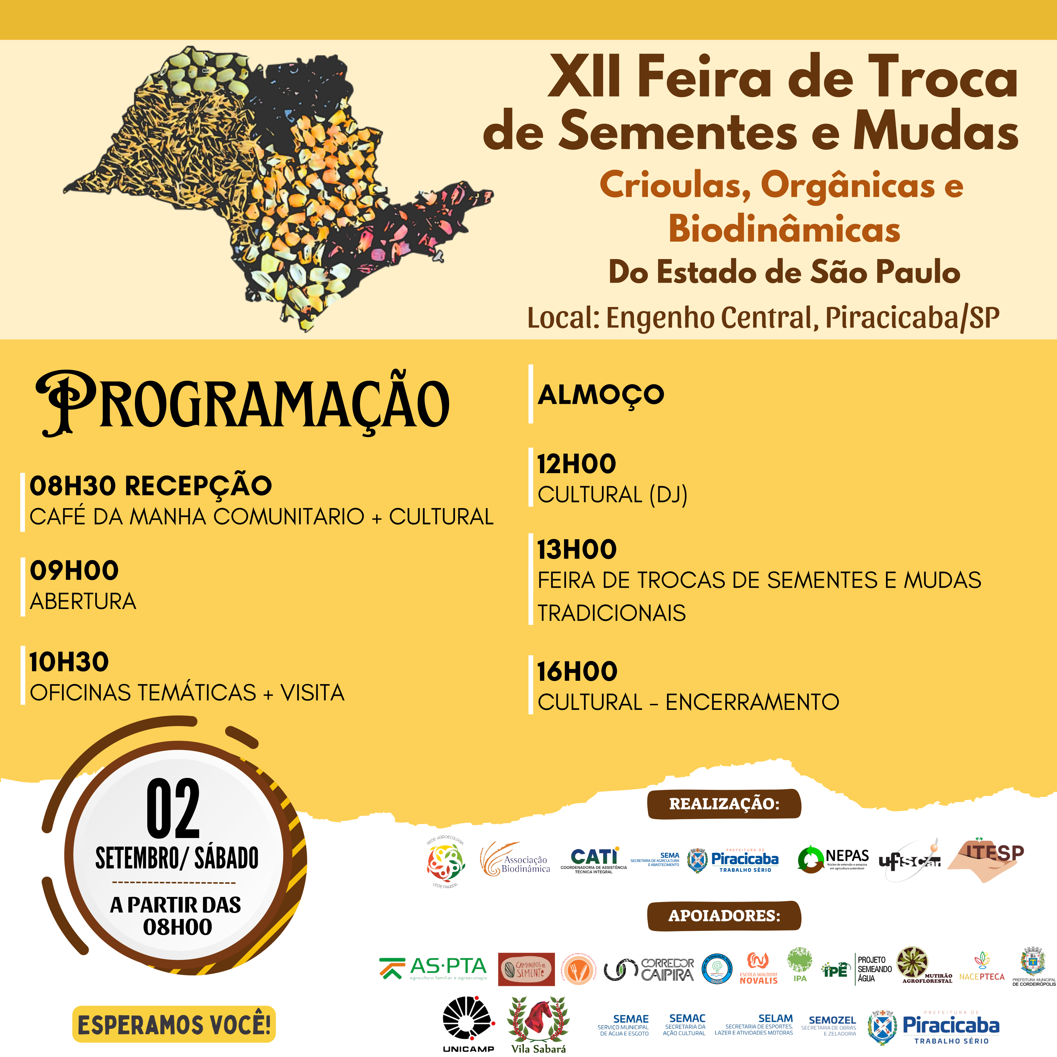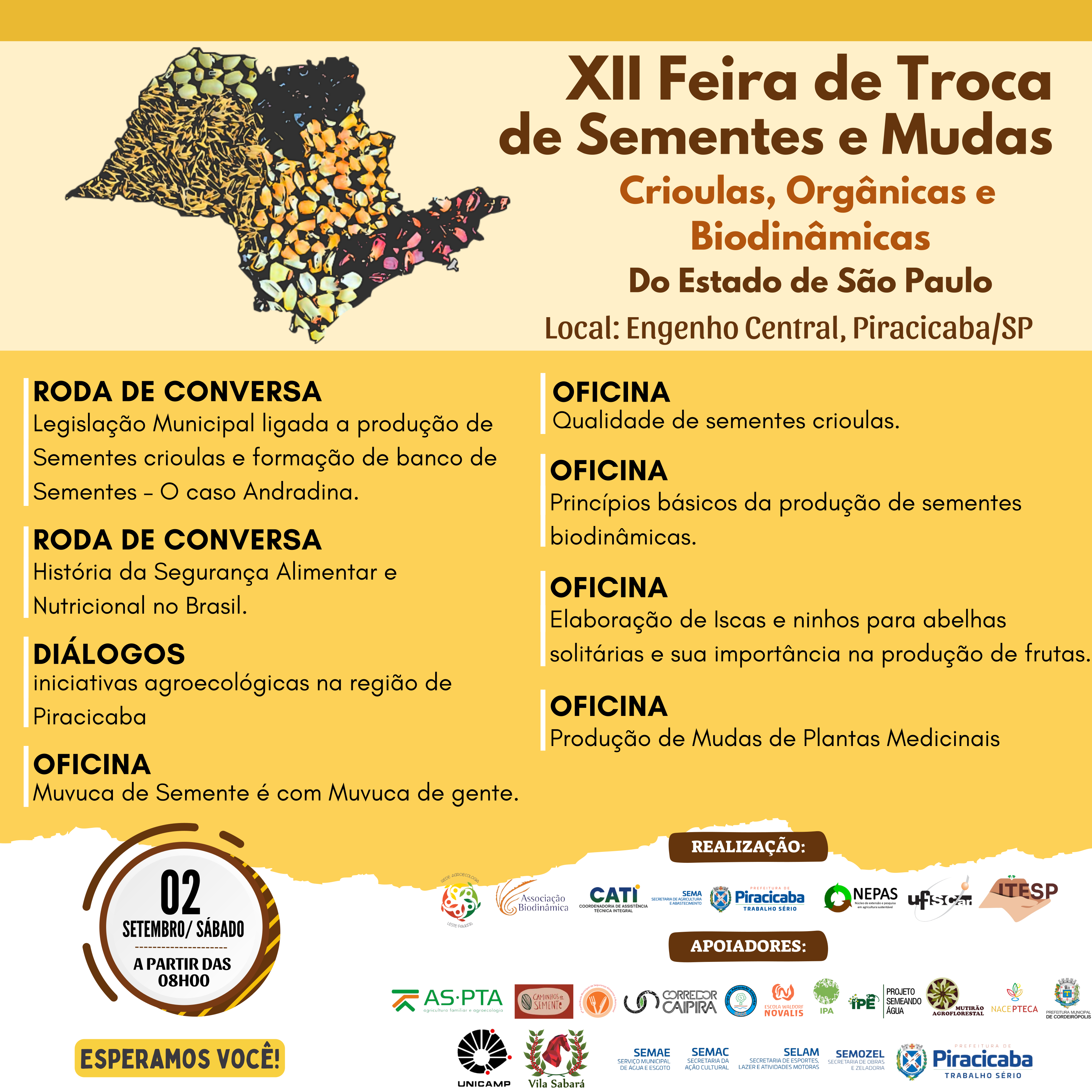 No dia 2 de setembro o Projeto Semeando Água estará na XII Feira de Troca de Sementes e Mudas Crioulas, Orgânicas e Biodinâmicas do Estado de São Paulo. O evento será realizado em Piracicaba, no Engenho Central (Av. Dr. Maurice Allain, 454) a partir das 8hrs. A feira contará com oficinas, visita técnica a horta agroecológica e programação cultural.
